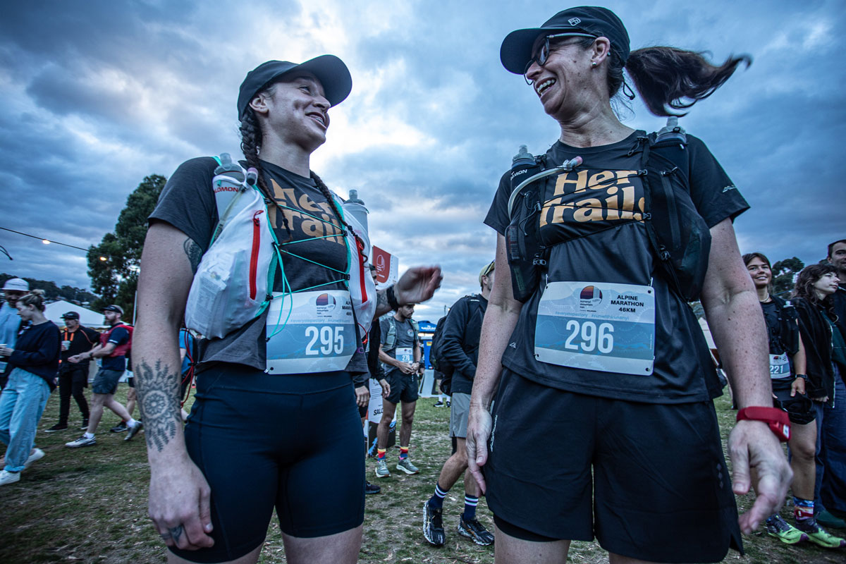 Keely Cooper and Elise Jeffrey from the run club Her Trails set off for the Alpine Marathon 46km.