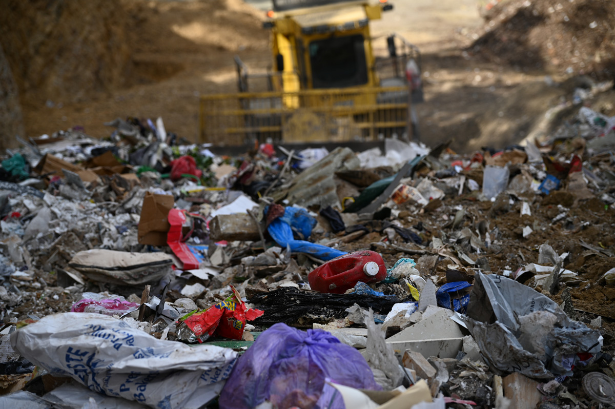 Waste collected from red-lidded bins being crushed and buried at The Tip.