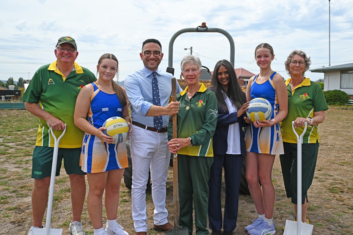 Members of the Buckingham Bowls Club joined Southern Tasmanian Netball Association players to launch the project. Pictured left to right are Phil Wheatley, Emily Carnes, Liberal Member for Clark Simon Behrakis, Buckingham Bowls Club president Patricia Zapotocky, Hobart Deputy Lord Mayor Dr Zelinda Sherlock, Izzy Adams and Jill Kyle.