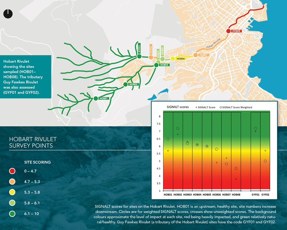 This study uses the presence and diversity of waterbugs to provide a benchmark for the ecological health of Hobart's four major rivulets (from north to south):