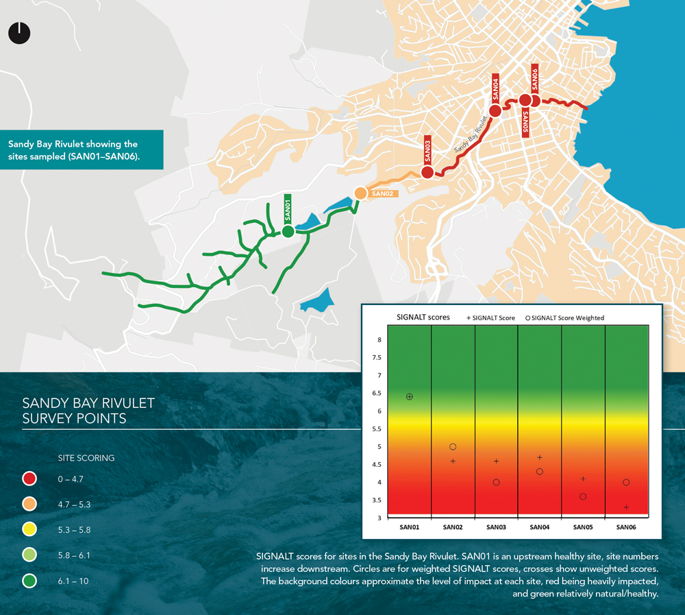 Sandy Bay Rivulet is in good condition upstream of Waterworks Reserve, but drops markedly almost immediately downstream. The ecological health as measured by weighted SIGNALT of the system continues to decline downstream.