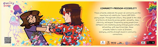 SOAPBOX reflects the courage, vision, and creativity of OutSpace members, who shared their insights and experiences to bring the project to life. Their voices remind us of the importance of visibility, community, and the right of queer youth to take up public space. The City of Hobart acknowledges and thanks all the young people, artists, and collaborators who made SOAPBOX possible, including RANT Arts, YARC, and the wider community of supporters.