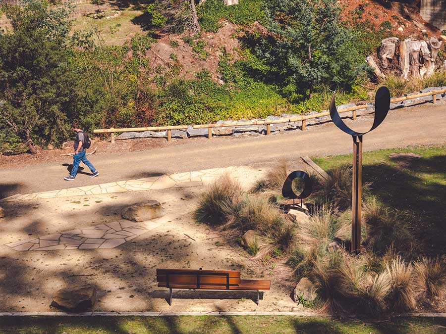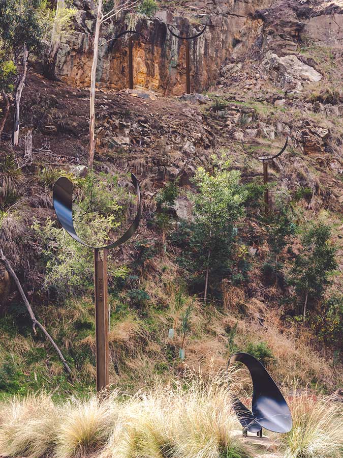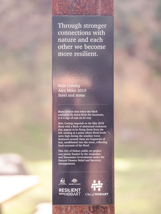 Rain Coming was installed in the linear park running beside the Hobart Rivulet in late 2019.